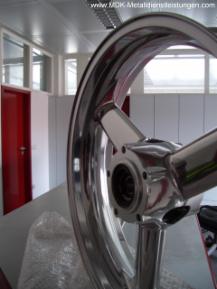 Optimierung der Qualität. Wir haben zu dieser Zeit Muster Felgen bearbeiten lassen und unzählige Vorschleif- und Hochglanzcompound´s versucht um ein reproduktives Konzept anbieten zu können.